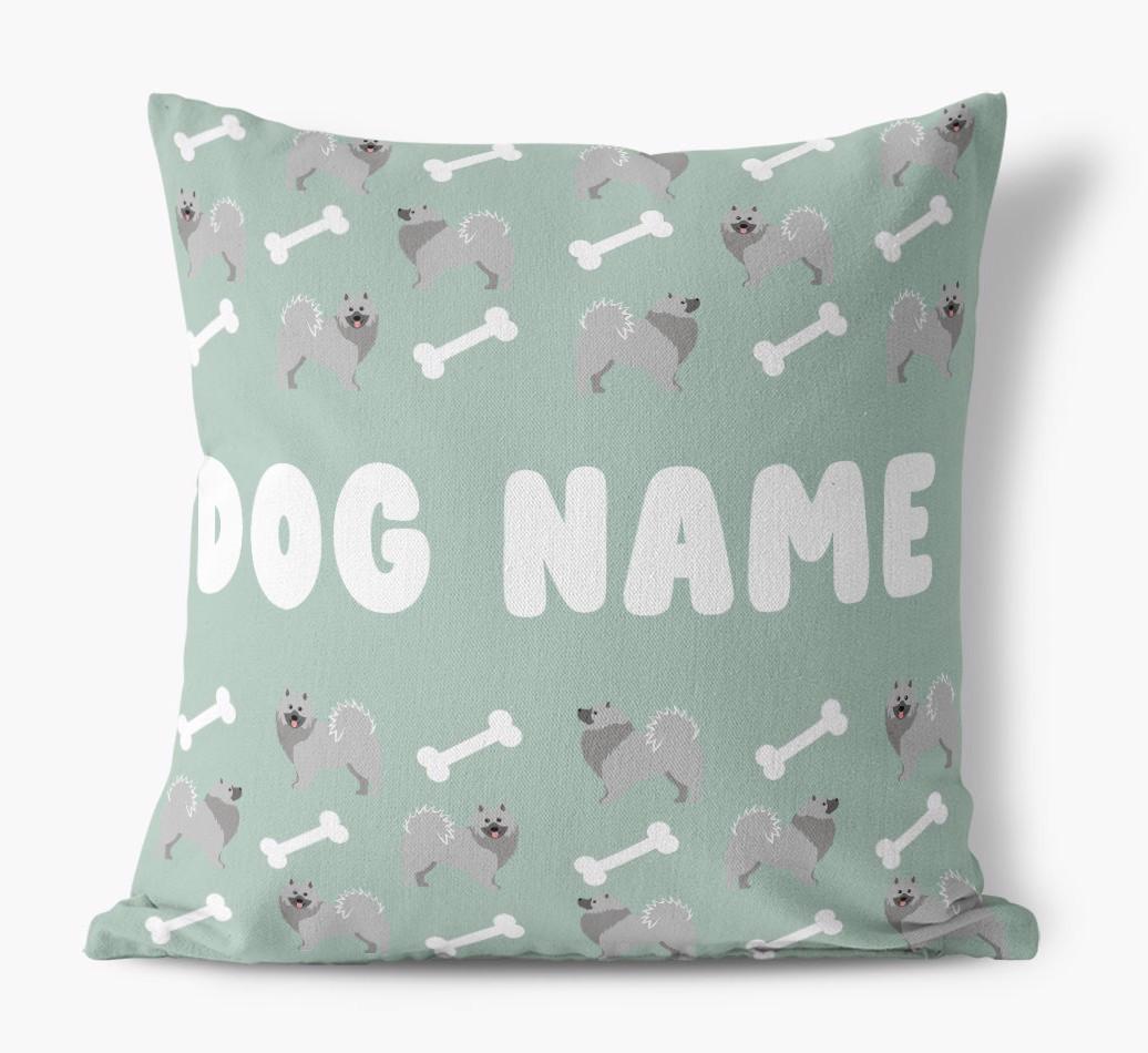Personalized with Keeshond’s name against a background of Keeshond icons and bones, this gorgeous pillow is full of pawsonality.