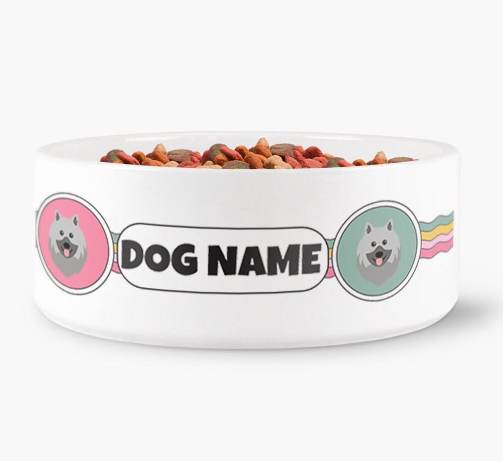 This jazzy dog bowl is sure to make waves with Keeshond! With a colorful wavy pattern, this bowl is personalized with adorable Keeshond icons and Keeshond’s name to make it extra special.