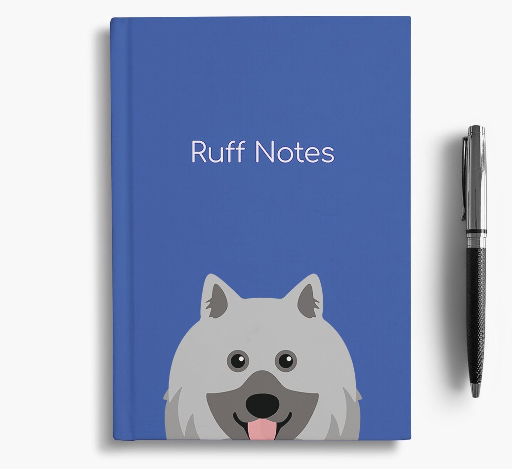 The front cover features our exclusive Keeshond peeking icon and is printed with the words, ‘Ruff Notes’, whilst the back is printed with the words ‘Live. Laugh. Woof.’.