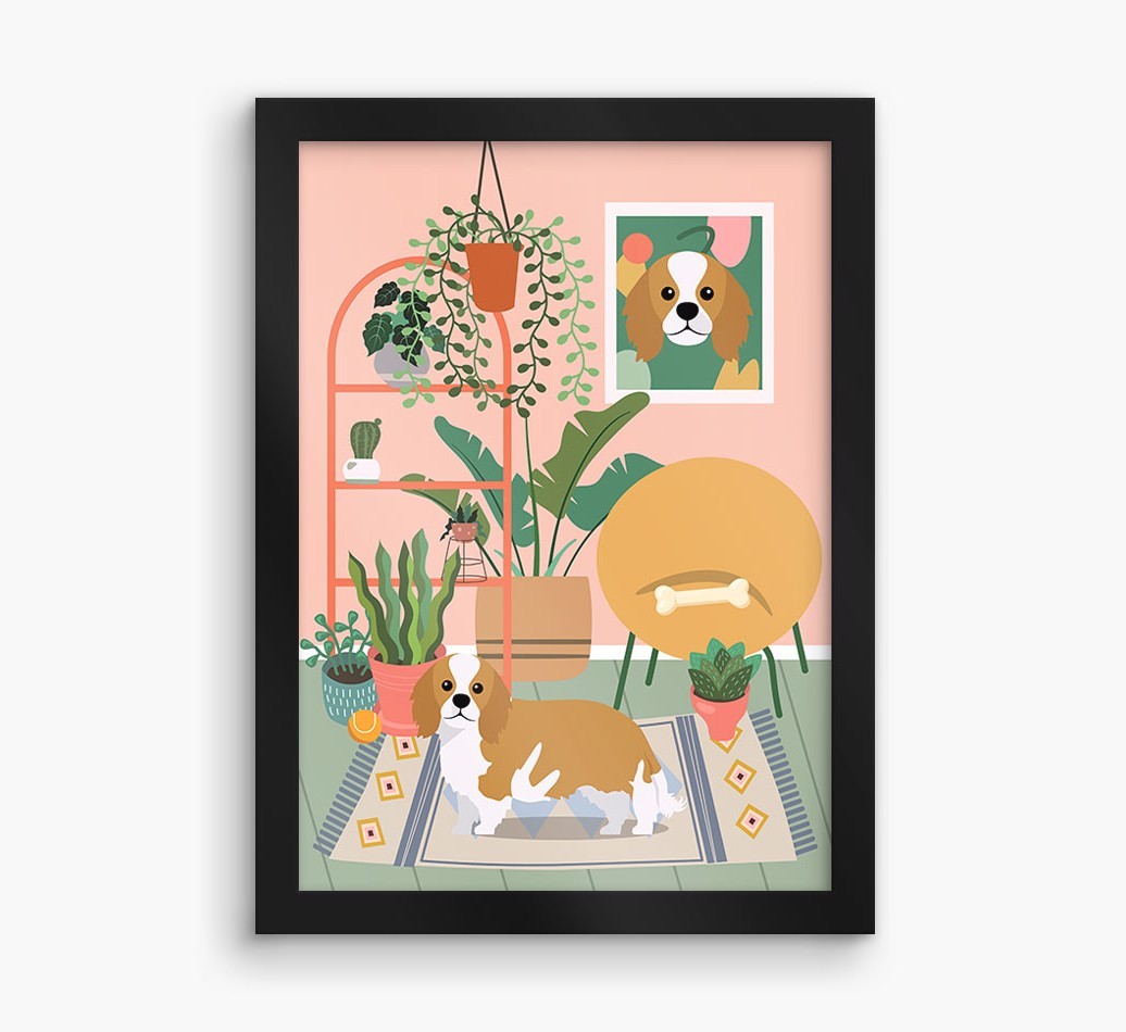 This contemporary piece of wall art pairs a chic living space with lovely pastel tones and a jungle of houseplants. Complete with the one that makes your house a home - King Charles Spaniel! - this print is a wonderful way to display your love for your pooch.