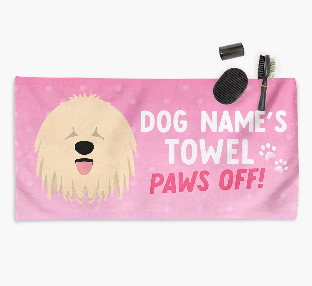 Perfect for messy pups and for pampering your Komondor at bathtime, this soft and absorbent towel is made for cleaning your mucky pup and drying them off in a flash. It's personalized with Komondor's name and icon and is printed with a message for everyone else to keep their paws off it!