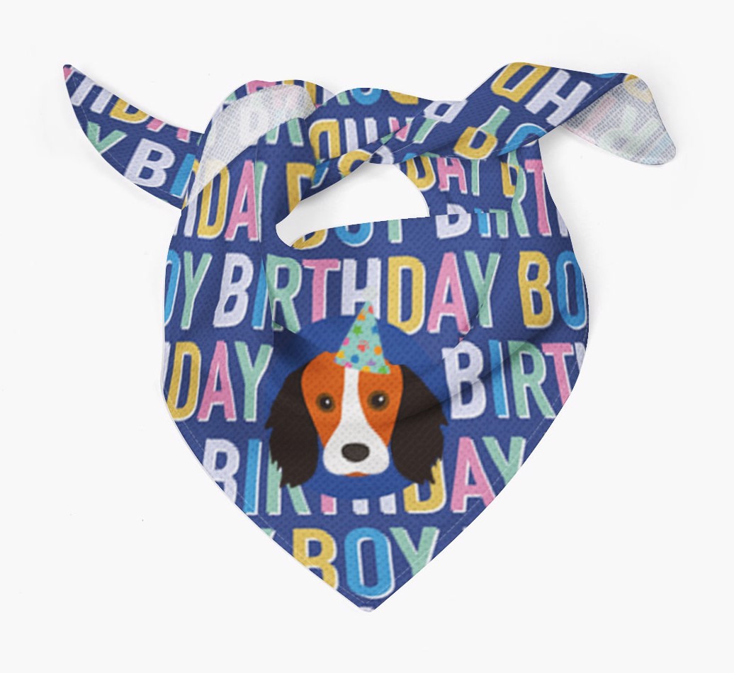 Featuring a colorful text pattern that reads 'birthay boy' and personalized with Kooikerhondje's cute icon (complete with a fun party hat), your Kooiker will look simply pawgeous on their special day when they're wearing this bandana.