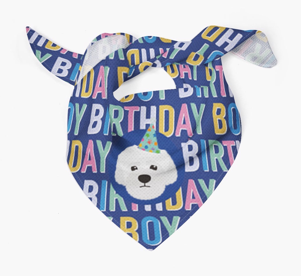 Featuring a colorful text pattern that reads 'birthay boy' and personalized with Lagotto Romagnolo's cute icon (complete with a fun party hat), your Lagotto will look simply pawgeous on their special day when they're wearing this bandana.