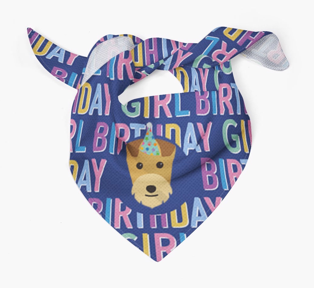 Featuring a text pattern that reads 'birthay girl' and personalized with Lakeland Terrier's cute icon (complete with a fun party hat), your Lakie will look simply pawgeous on their special day when they're wearing this bandana.