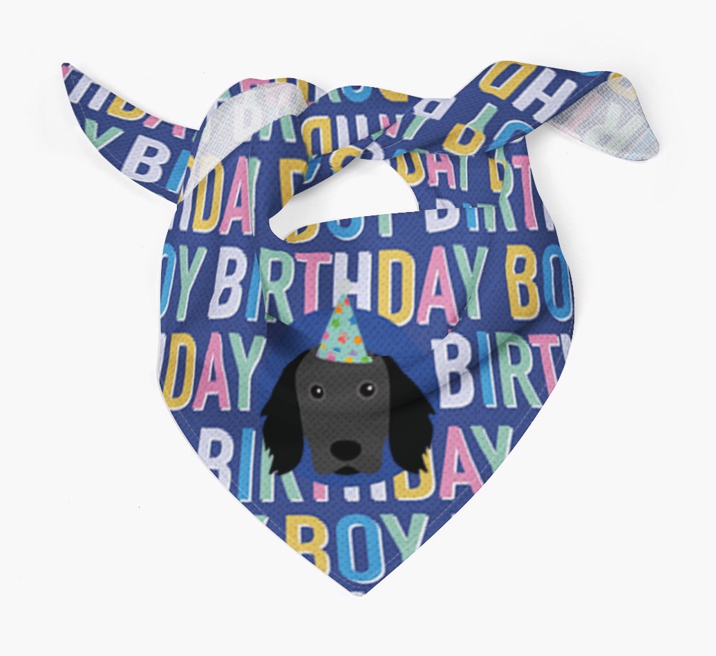 Featuring a colorful text pattern that reads 'birthay boy' and personalized with Large Munsterlander's cute icon (complete with a fun party hat), your Munsterlander will look simply pawgeous on their special day when they're wearing this bandana.