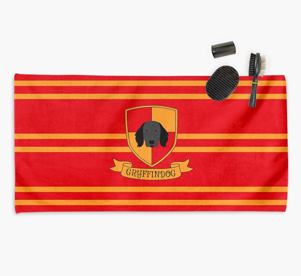 Soft and absorbent, this lightweight towel is perfect for drying off your furry friend in a flash. It features your pup's magical icon and is available in a choice of (dog)house colors. The only question is - does your pup belong in Hufflewoof, Slobberin, Ravenpaw or Gryffindog?
