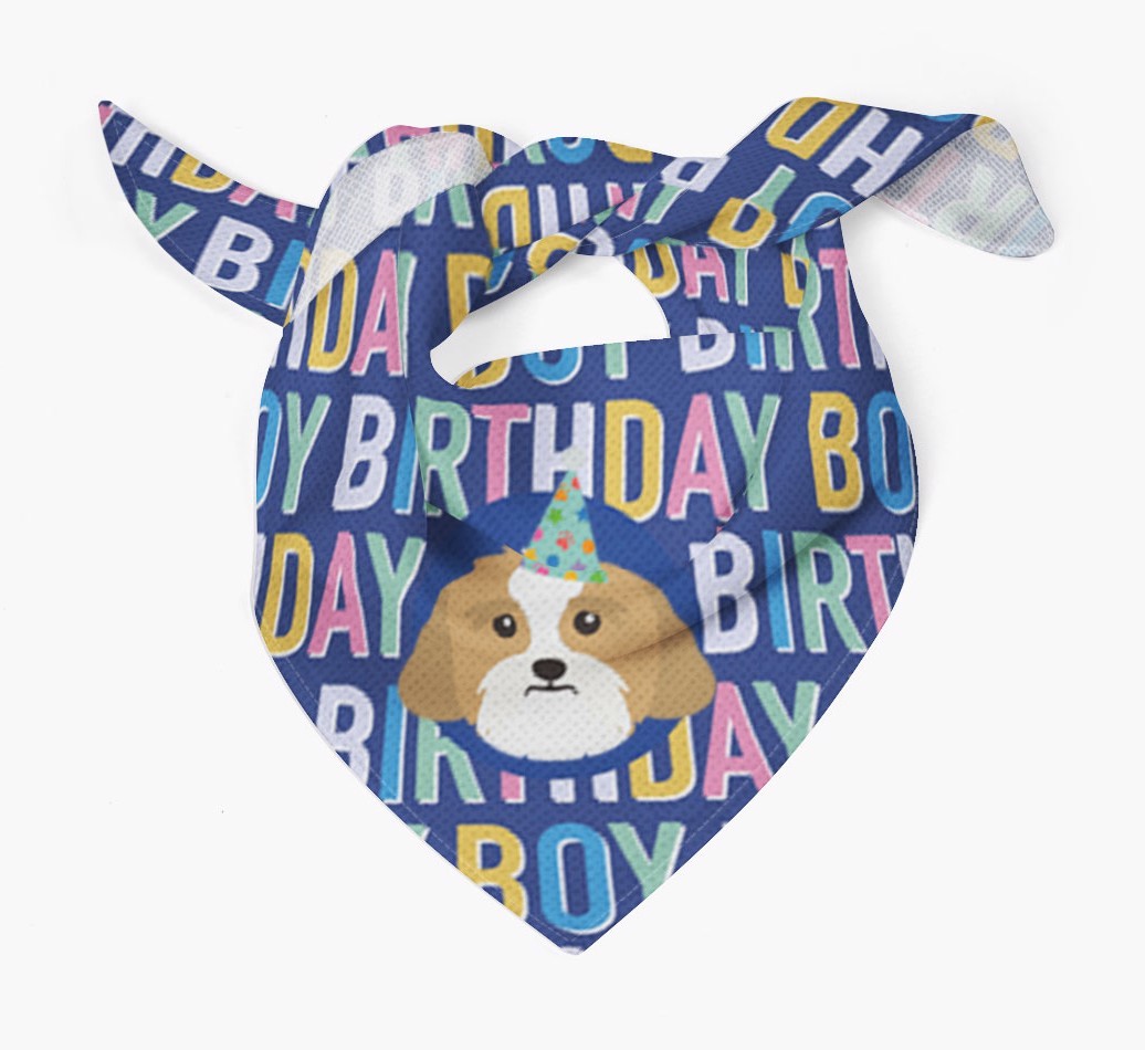 Featuring a colorful text pattern that reads 'birthay boy' and personalized with Lhasa Apso's cute icon (complete with a fun party hat), your Lhasa Apso will look simply pawgeous on their special day when they're wearing this bandana.