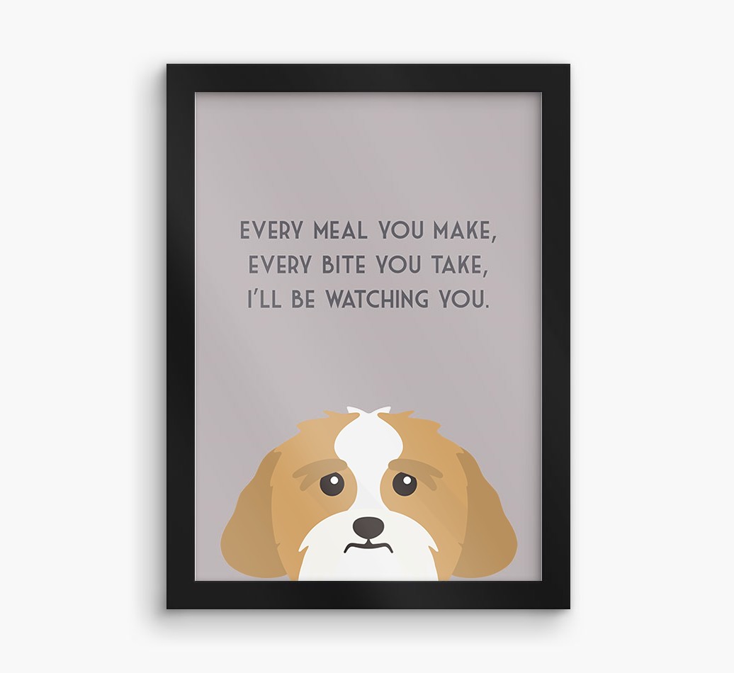 Printed with the words, ‘Every meal you make, every bite you take, I’ll be watching you’ and complete with our cute Lhasa Apso peeking from the bottom of the design, this artwork will look great on display in the kitchen or anywhere Lhasa Apso likes to watch you eat!