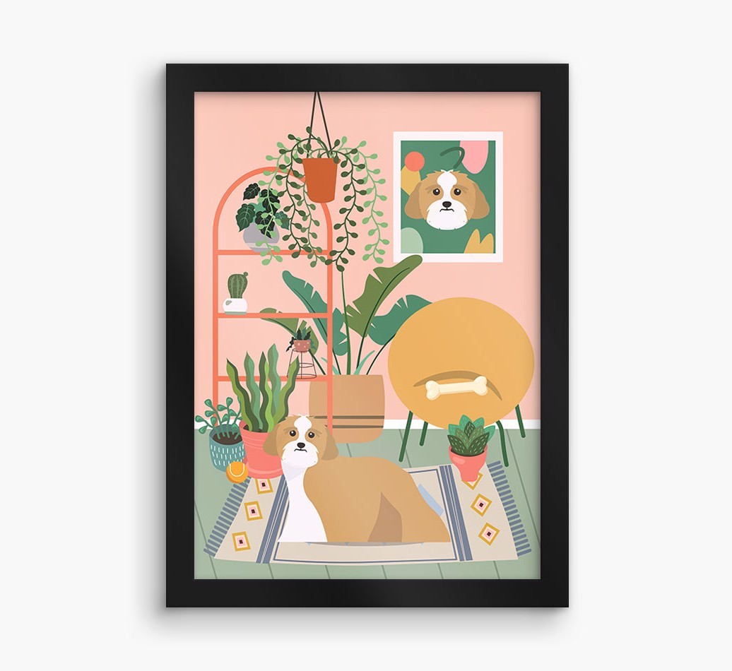 This contemporary piece of wall art pairs a chic living space with lovely pastel tones and a jungle of houseplants. Complete with the one that makes your house a home - Lhasa Apso! - this print is a wonderful way to display your love for your pooch.