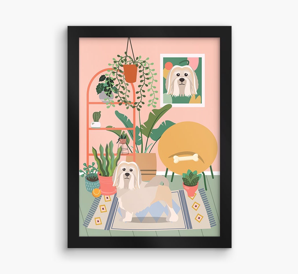 This contemporary piece of wall art pairs a chic living space with lovely pastel tones and a jungle of houseplants. Complete with the one that makes your house a home - Löwchen! - this print is a wonderful way to display your love for your pooch.