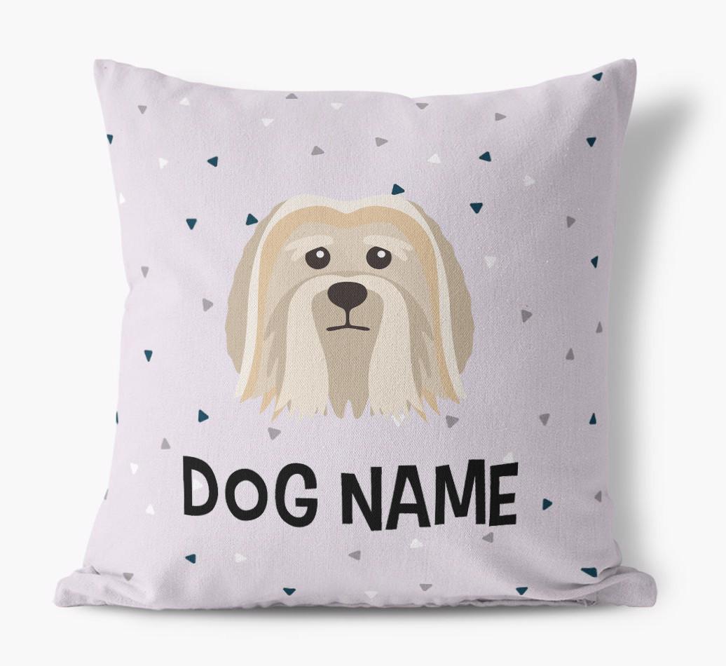 Featuring a stylish triangle pattern, this pillow is available in 5 wagnificent colors and is personalized just for Your Löwchen, making is extra special.