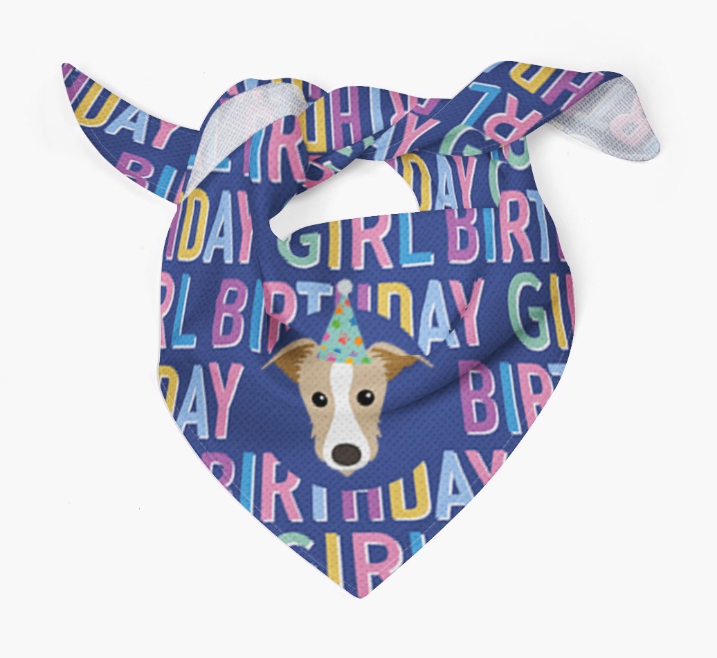 Featuring a text pattern that reads 'birthay girl' and personalized with Lurcher's cute icon (complete with a fun party hat), your Lurcher will look simply pawgeous on their special day when they're wearing this bandana.