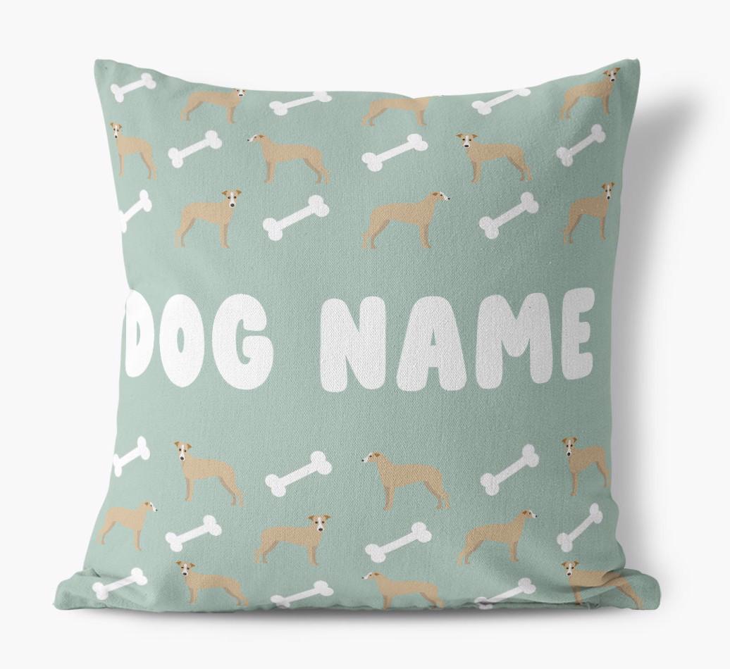 Personalized with Lurcher’s name against a background of Lurcher icons and bones, this gorgeous pillow is full of pawsonality.