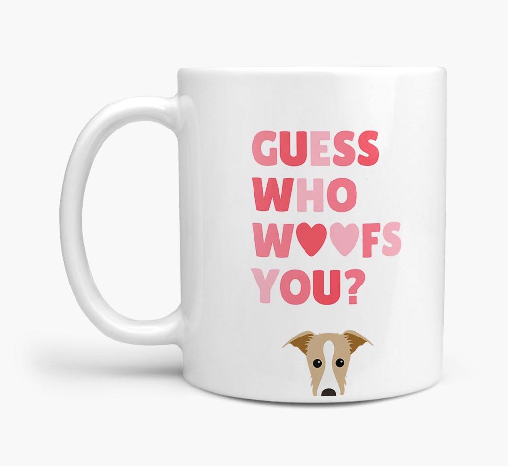 Personalized with Lurcher's cute face, this adorable mug is perfect for showing off the one who "woofs" you - how sweet!