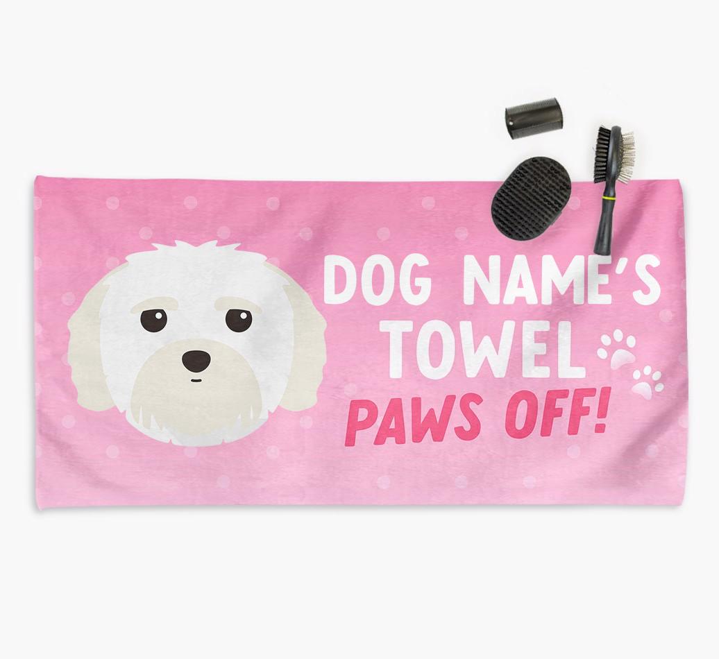 Perfect for messy pups and for pampering your Mal-Shi at bathtime, this soft and absorbent towel is made for cleaning your mucky pup and drying them off in a flash. It's personalized with Mal-Shi's name and icon and is printed with a message for everyone else to keep their paws off it!