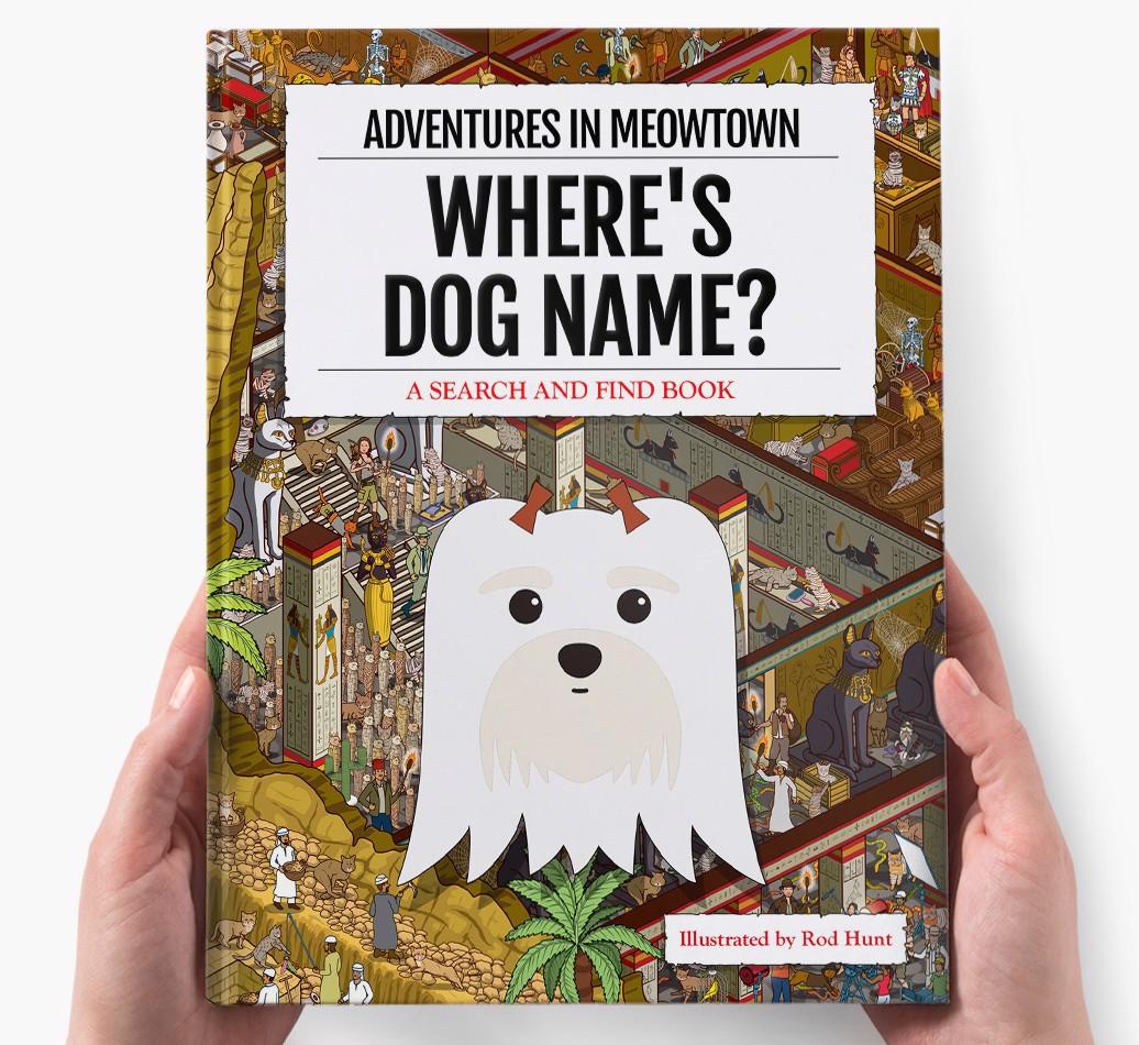 Get ready to unleash your inner detective with our popular Search & Find book, ‘Where’s (insert dog name)?’ It’s the personalized dog book everyone’s yapping about! With twelve beautifully illustrated locations to explore, we challenge you to find your adventurous {breedShortName} on each action-packed page. Can you spot all the canine cameos and funny parodies too?