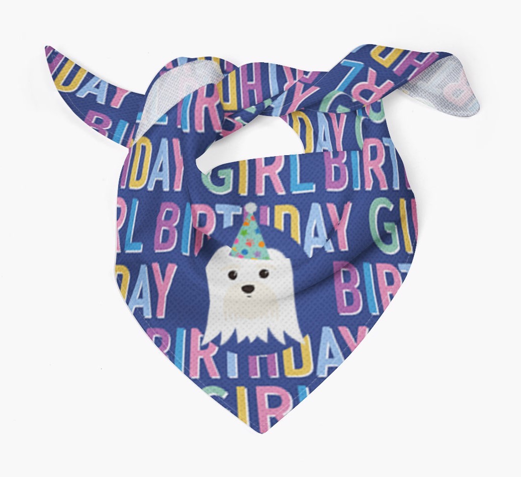 Featuring a text pattern that reads 'birthay girl' and personalized with Maltese's cute icon (complete with a fun party hat), your Maltese will look simply pawgeous on their special day when they're wearing this bandana.