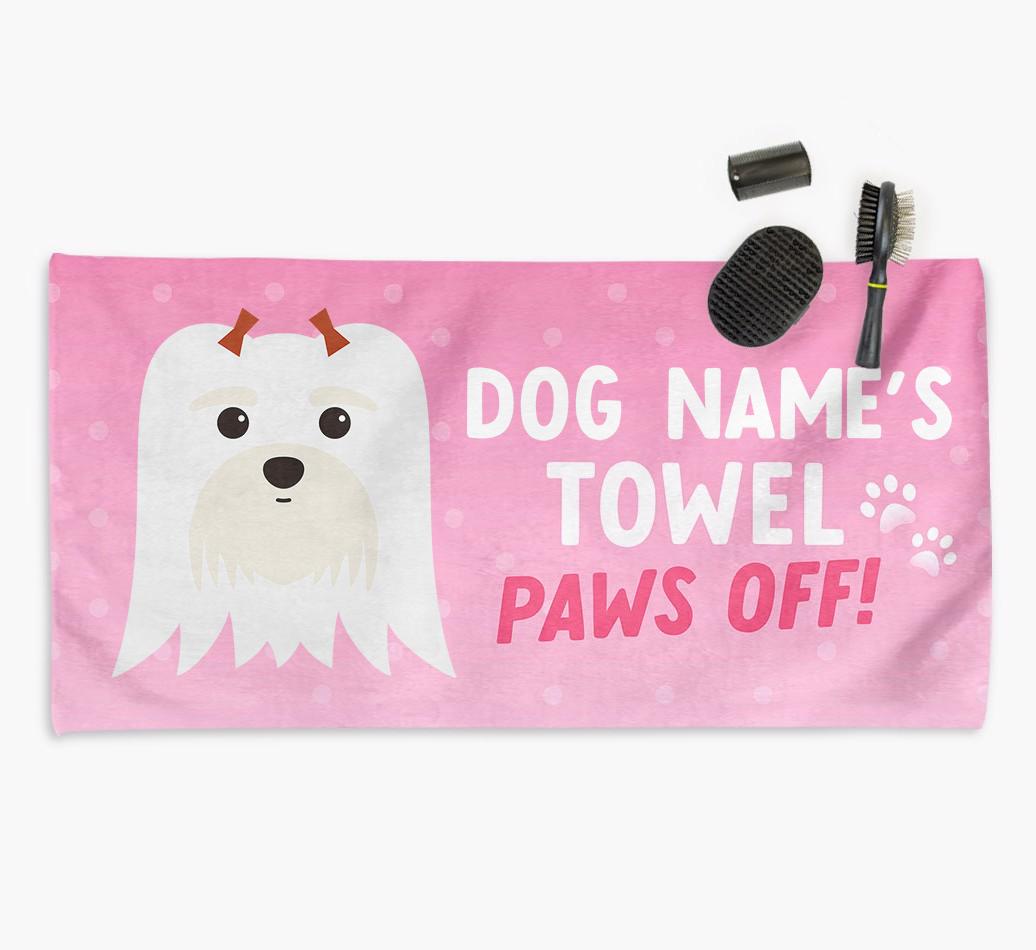 Perfect for messy pups and for pampering your Maltese at bathtime, this soft and absorbent towel is made for cleaning your mucky pup and drying them off in a flash. It's personalized with Maltese's name and icon and is printed with a message for everyone else to keep their paws off it!