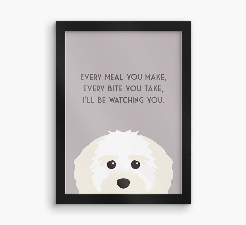 Printed with the words, ‘Every meal you make, every bite you take, I’ll be watching you’ and complete with our cute Maltichon peeking from the bottom of the design, this artwork will look great on display in the kitchen or anywhere Maltichon likes to watch you eat!