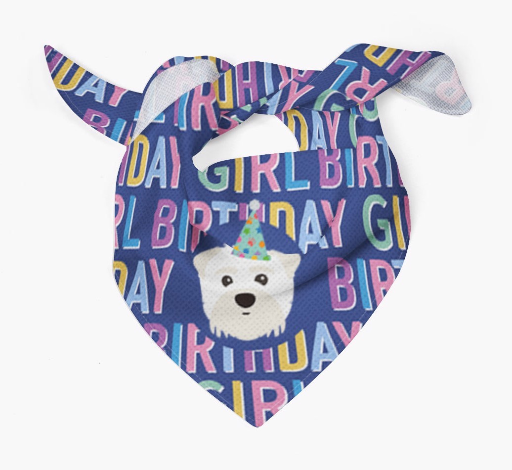 Featuring a text pattern that reads 'birthay girl' and personalized with Maltipom's cute icon (complete with a fun party hat), your Maltipom will look simply pawgeous on their special day when they're wearing this bandana.