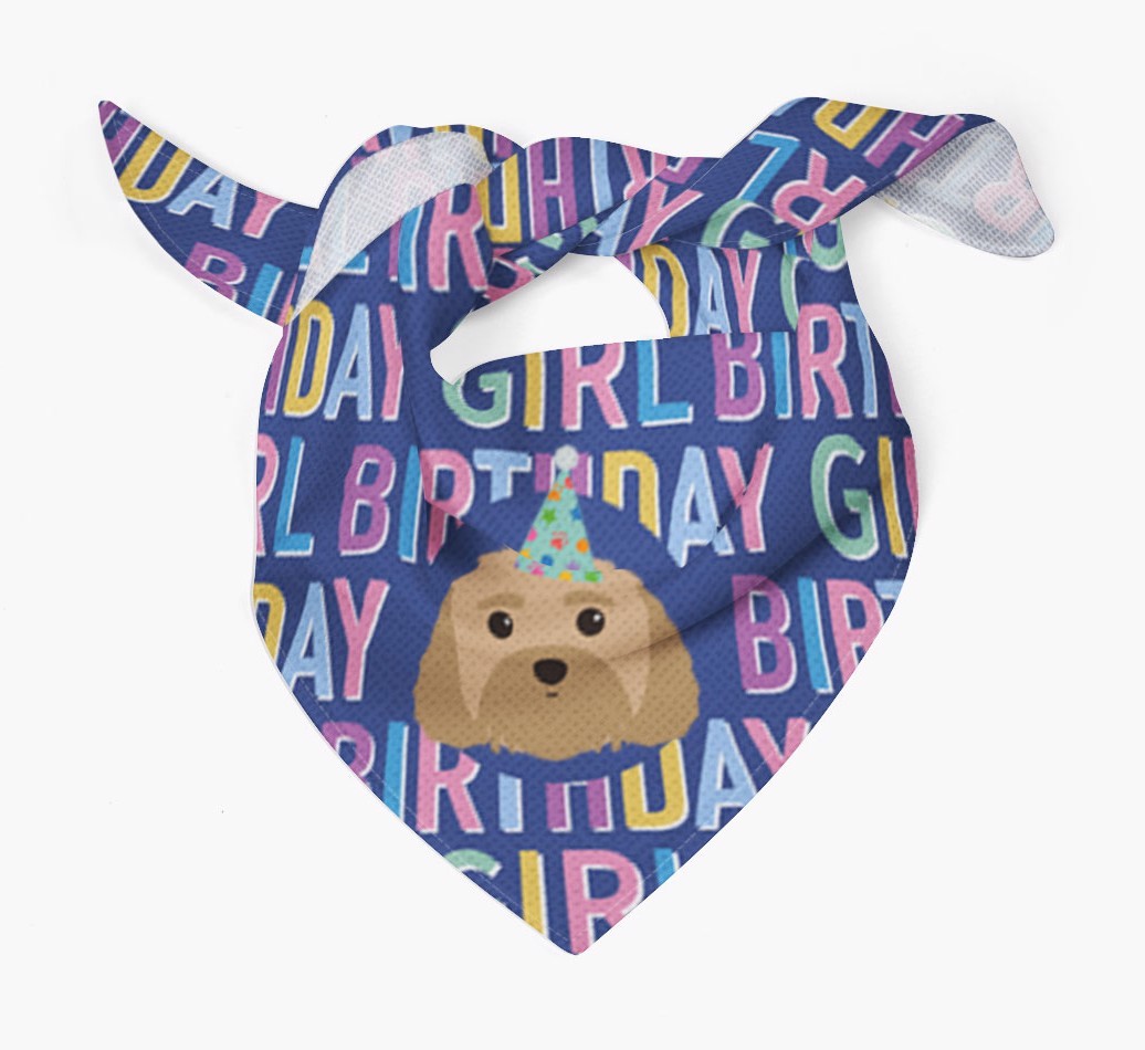 Featuring a text pattern that reads 'birthay girl' and personalized with Malti-Poo's cute icon (complete with a fun party hat), your Malti-Poo will look simply pawgeous on their special day when they're wearing this bandana.
