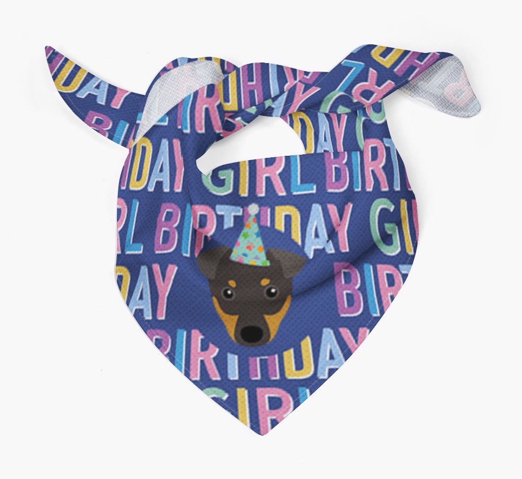 Featuring a text pattern that reads 'birthay girl' and personalized with Manchester Terrier's cute icon (complete with a fun party hat), your Terrier will look simply pawgeous on their special day when they're wearing this bandana.