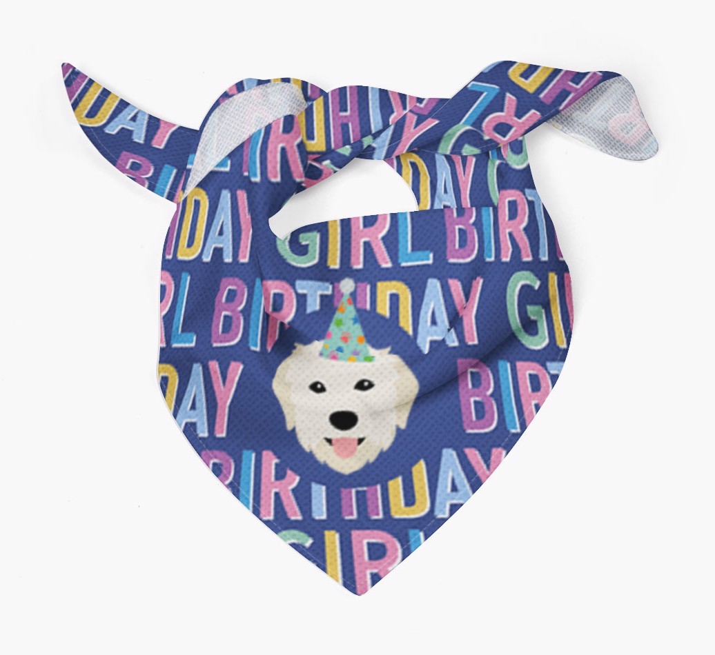 Featuring a text pattern that reads 'birthay girl' and personalized with Maremma Sheepdog's cute icon (complete with a fun party hat), your Maremma will look simply pawgeous on their special day when they're wearing this bandana.