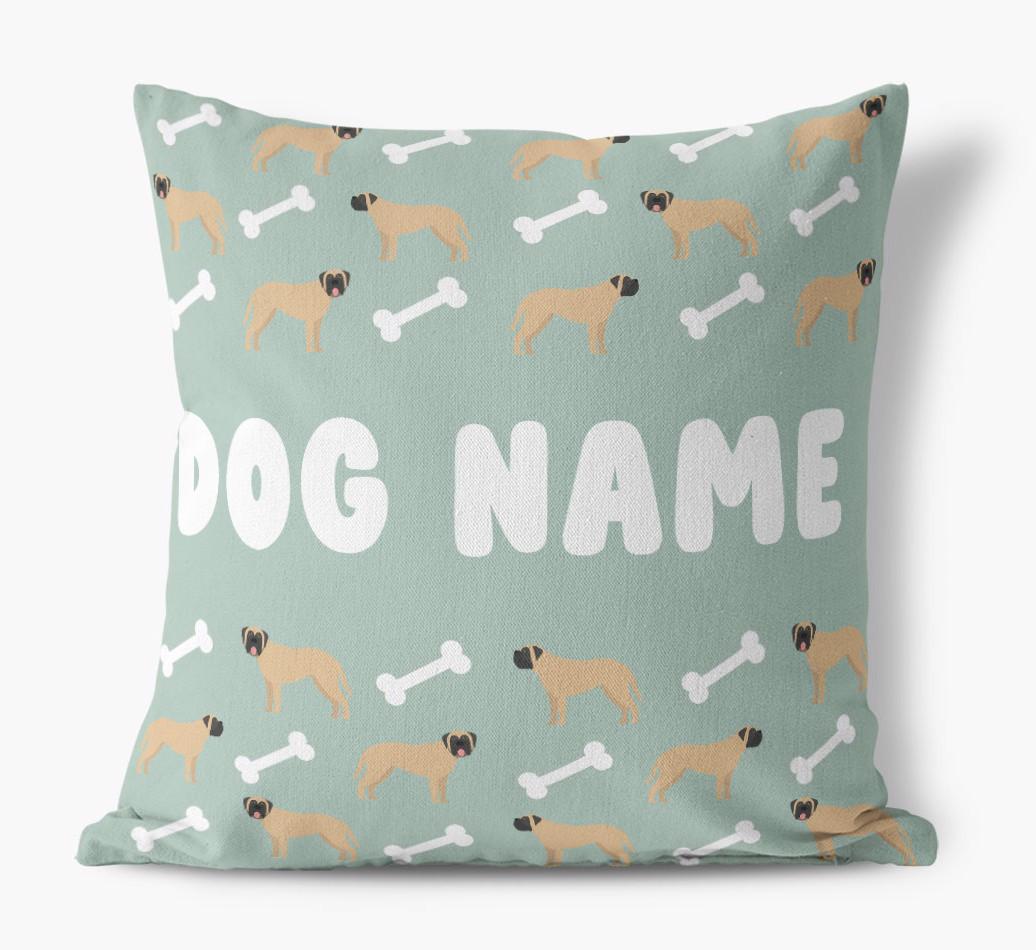 Personalized with Mastiff’s name against a background of Mastiff icons and bones, this gorgeous pillow is full of pawsonality.