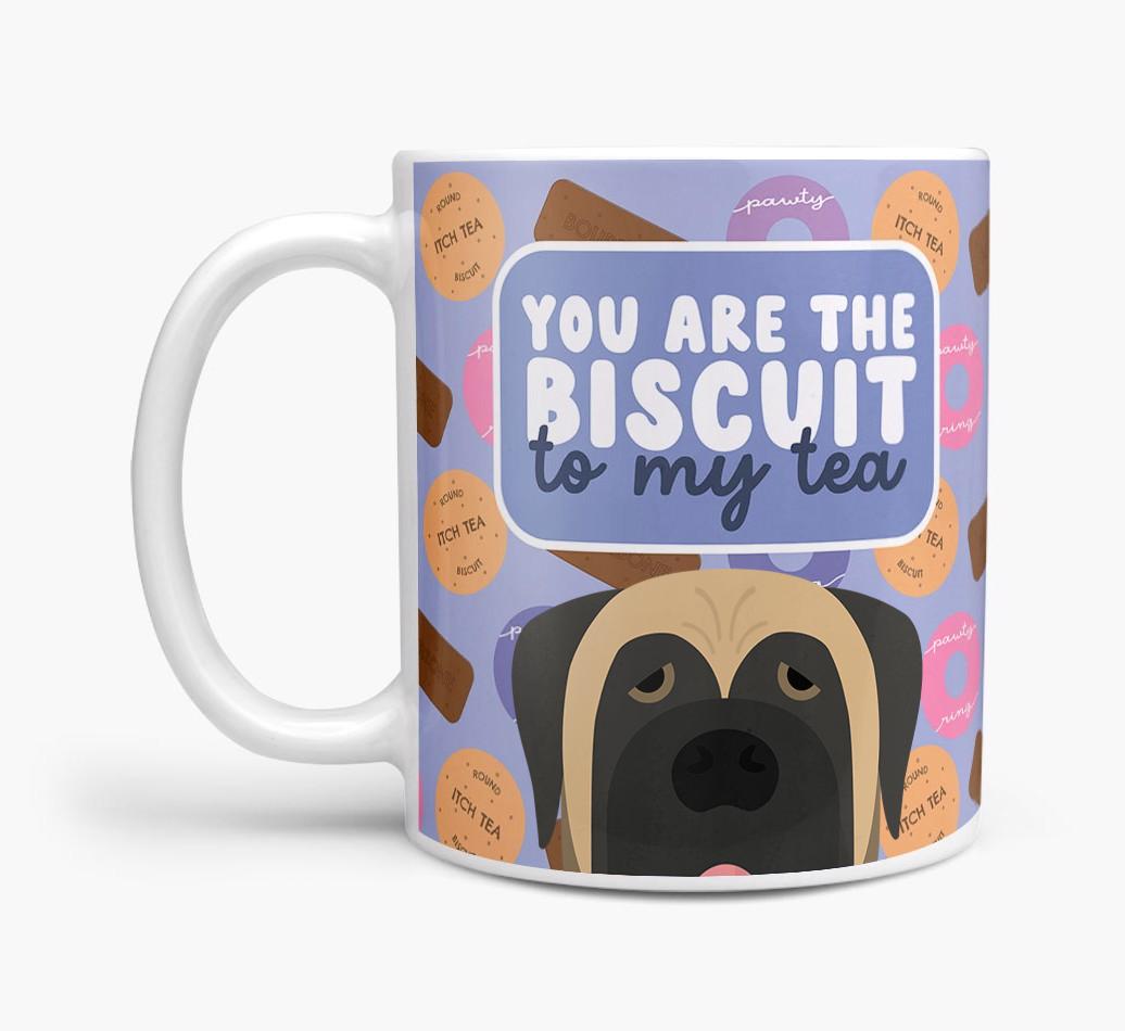 Featuring a cute biscuit motif paired with your Mastiff's adorable face, this mug is bound to be a firm favorite in every household.