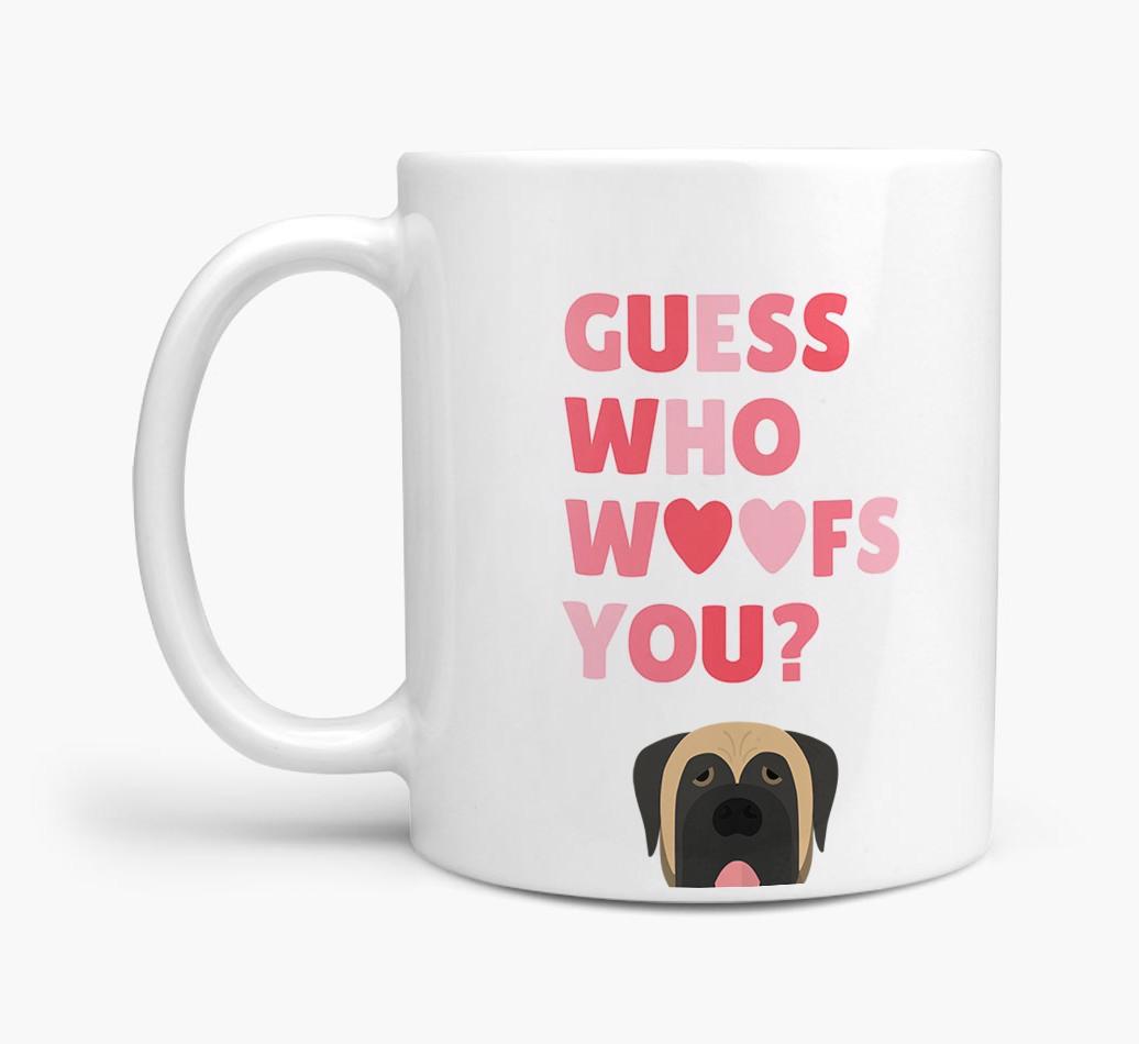 Personalized with Mastiff's cute face, this adorable mug is perfect for showing off the one who "woofs" you - how sweet!