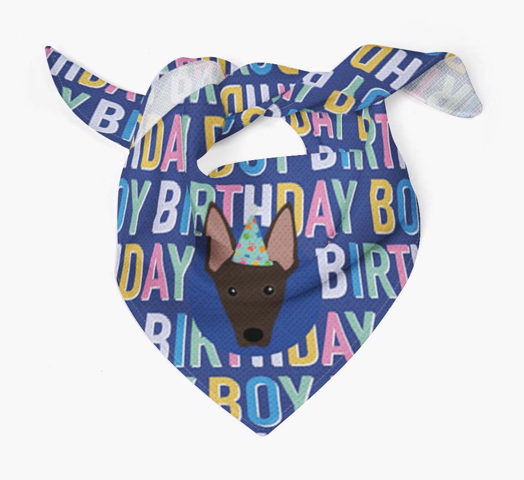 Featuring a colorful text pattern that reads 'birthay boy' and personalized with Mexican Hairless's cute icon (complete with a fun party hat), your Xolo will look simply pawgeous on their special day when they're wearing this bandana.