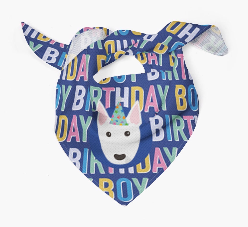 Featuring a colorful text pattern that reads 'birthay boy' and personalized with Miniature Bull Terrier's cute icon (complete with a fun party hat), your Bull Terrier will look simply pawgeous on their special day when they're wearing this bandana.