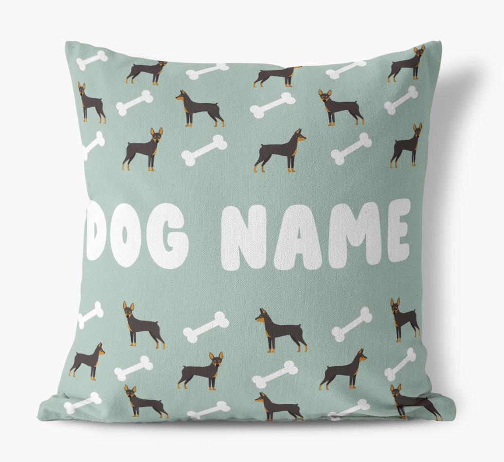 Personalized with Miniature Pinscher’s name against a background of Min Pin icons and bones, this gorgeous pillow is full of pawsonality.