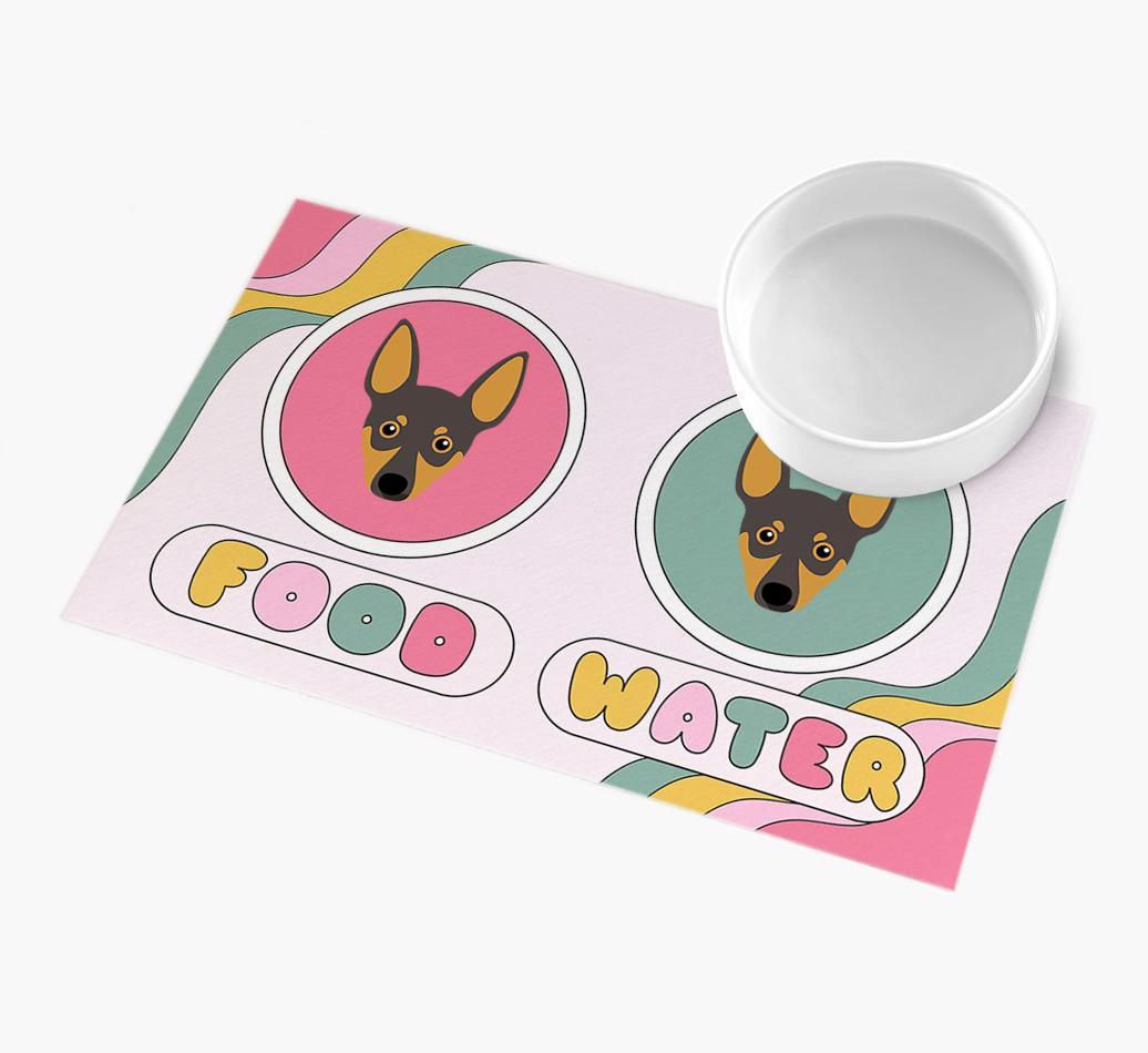 With a swirl of pastel colors and the addition of cute Miniature Pinscher icons, this feeding mat is a stylish place to sit Miniature Pinscher’s food and water bowls!