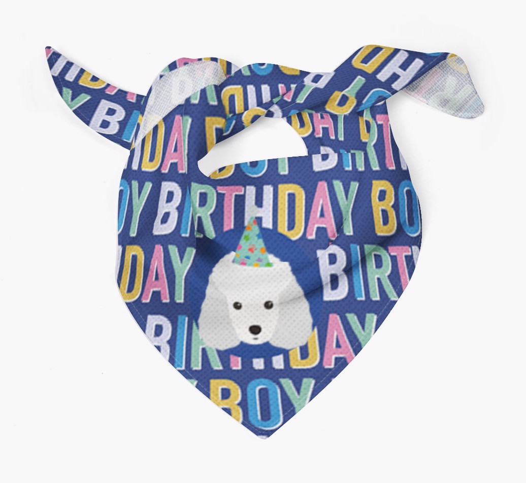 Featuring a colorful text pattern that reads 'birthay boy' and personalized with Miniature Poodle's cute icon (complete with a fun party hat), your Mini Poodle will look simply pawgeous on their special day when they're wearing this bandana.
