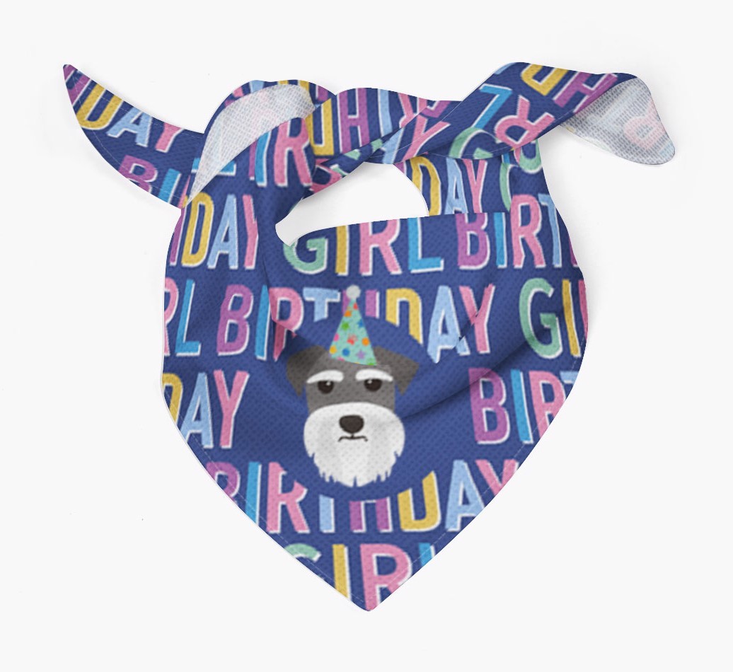 Featuring a text pattern that reads 'birthay girl' and personalized with Miniature Schnauzer's cute icon (complete with a fun party hat), your Schnauzer will look simply pawgeous on their special day when they're wearing this bandana.