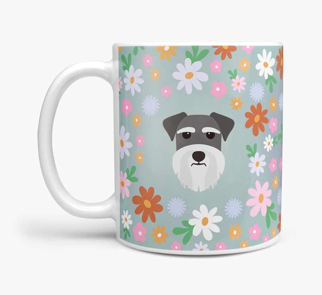 Featuring a colorful bunch of flowers, this mug is printed with the words 'woofly grandma' on one side of the mug and your Schnauzer's cute icon on the other. Bloomin' lovely!
