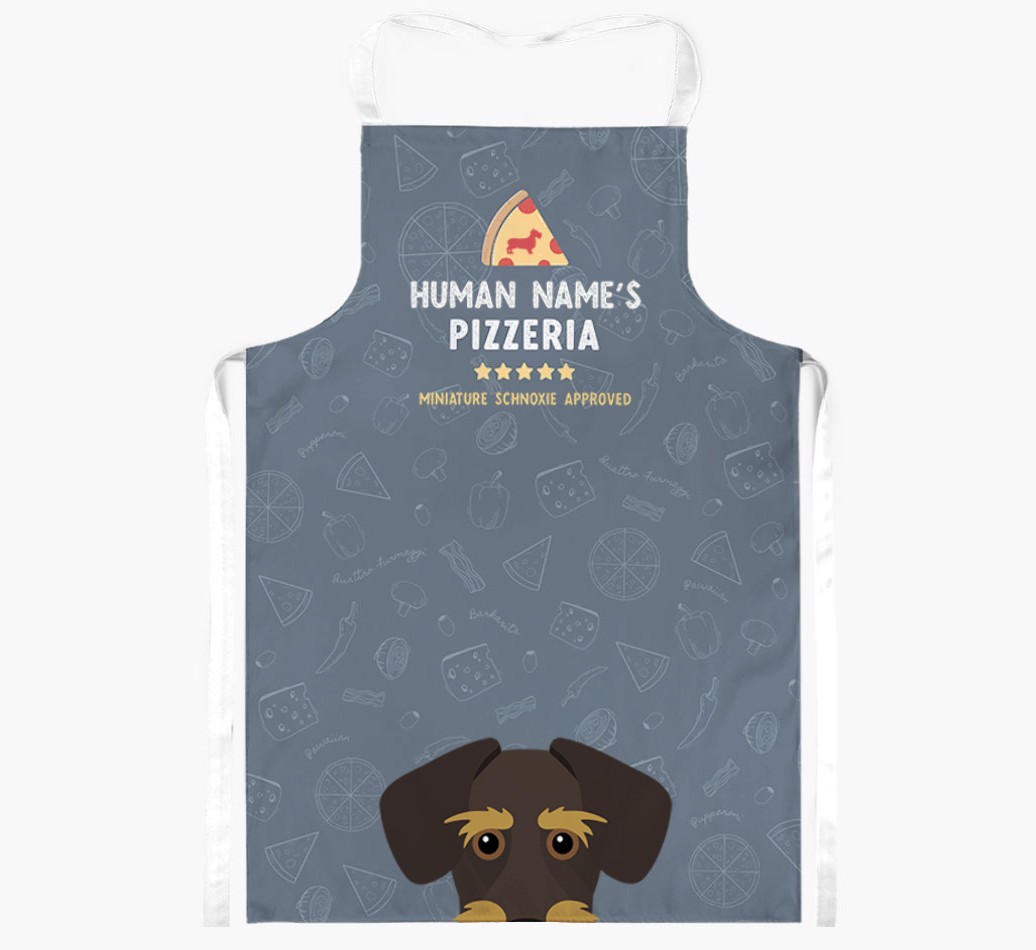 Featuring your furry friend's icon and lick of approval, plus your chosen human name, this apron is pawfect for anyone who considers themselves a pizza maestro in the kitchen. Available in a choice of 5 rustic colors, it'll make any Schnoxie lover happy.