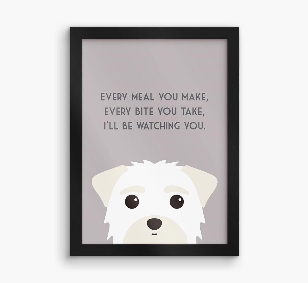 Printed with the words, ‘Every meal you make, every bite you take, I’ll be watching you’ and complete with our cute Morkie peeking from the bottom of the design, this artwork will look great on display in the kitchen or anywhere Morkie likes to watch you eat!