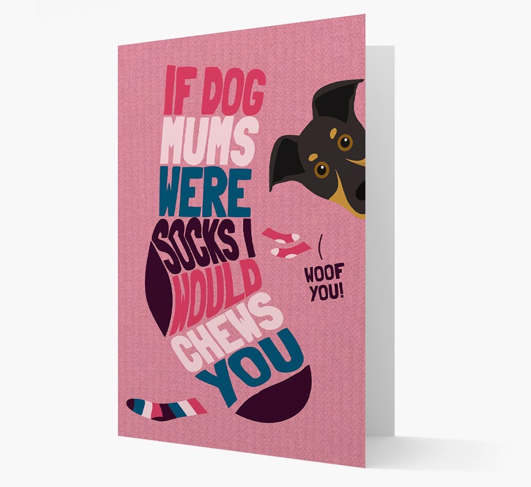 This comical card is pawfect for the Dog Mom who's pawrent to a sock-loving Huntaway.