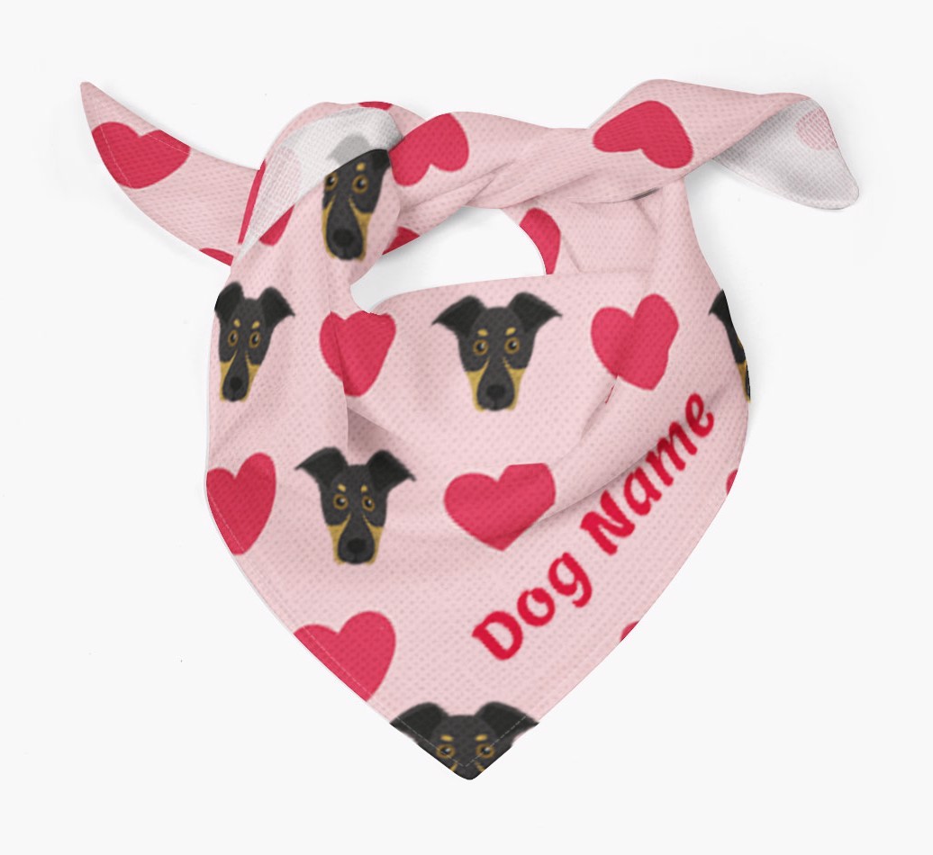 Featuring a pattern of love hearts and New Zealand Huntaway icons, this cute bandana is a woofly way for New Zealand Huntaway to dress up and share the puppy-love!