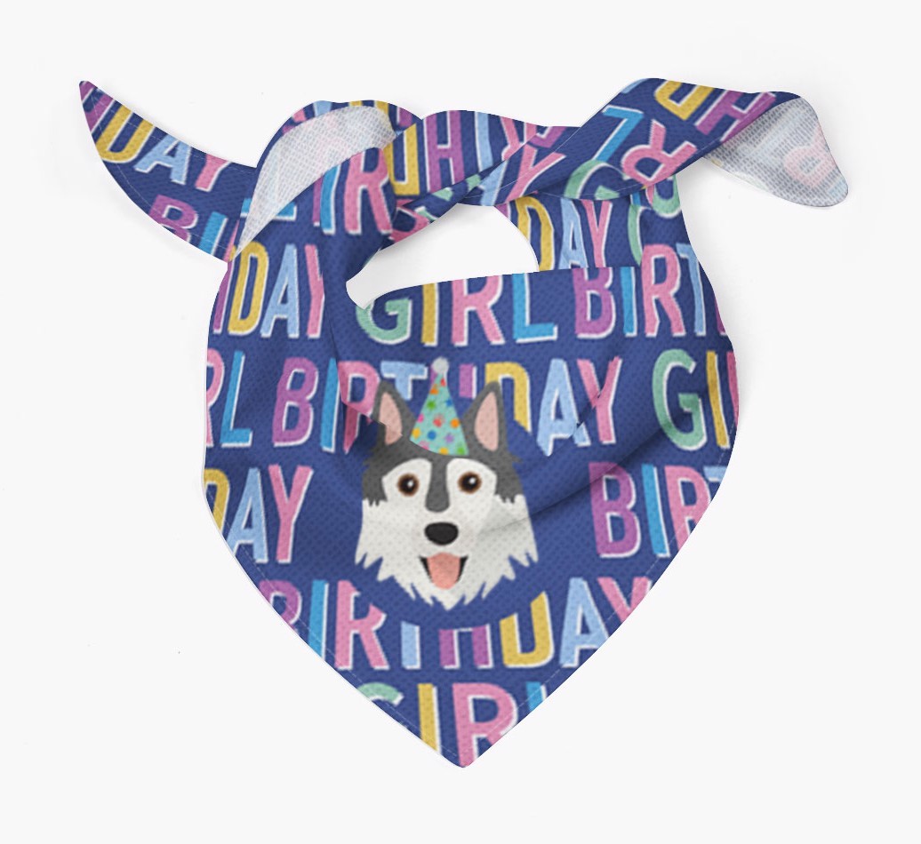 Featuring a text pattern that reads 'birthay girl' and personalized with Northern Inuit's cute icon (complete with a fun party hat), your Northern Inuit will look simply pawgeous on their special day when they're wearing this bandana.
