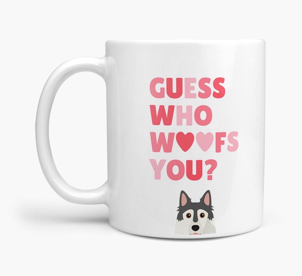 Personalized with Northern Inuit's cute face, this adorable mug is perfect for showing off the one who "woofs" you - how sweet!