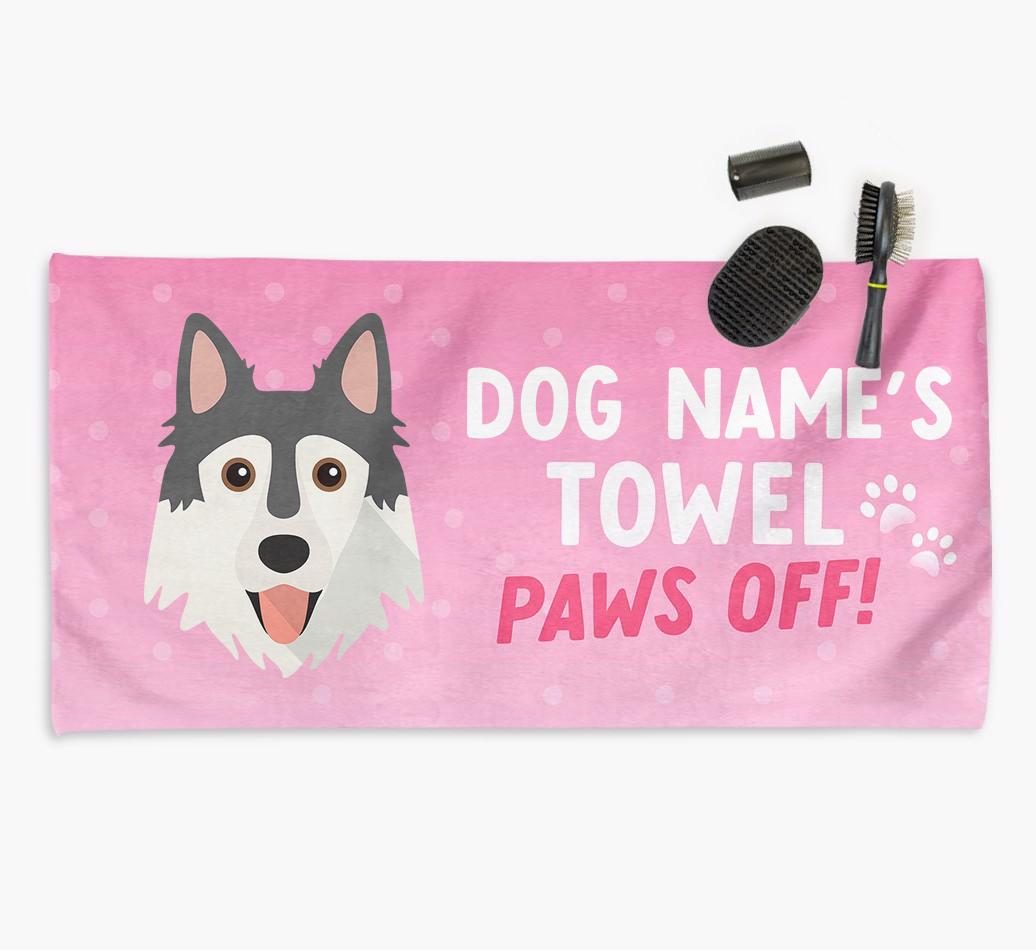 Perfect for messy pups and for pampering your Northern Inuit at bathtime, this soft and absorbent towel is made for cleaning your mucky pup and drying them off in a flash. It's personalized with Northern Inuit's name and icon and is printed with a message for everyone else to keep their paws off it!