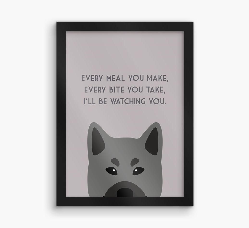 Printed with the words, ‘Every meal you make, every bite you take, I’ll be watching you’ and complete with our cute Elkhound peeking from the bottom of the design, this artwork will look great on display in the kitchen or anywhere Norwegian Elkhound likes to watch you eat!