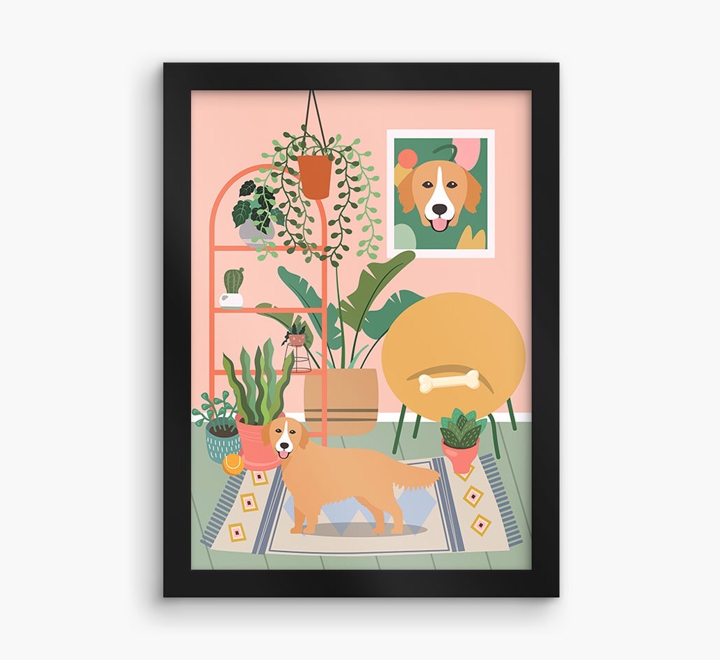 This contemporary piece of wall art pairs a chic living space with lovely pastel tones and a jungle of houseplants. Complete with the one that makes your house a home - Nova Scotia Duck Tolling Retriever! - this print is a wonderful way to display your love for your pooch.