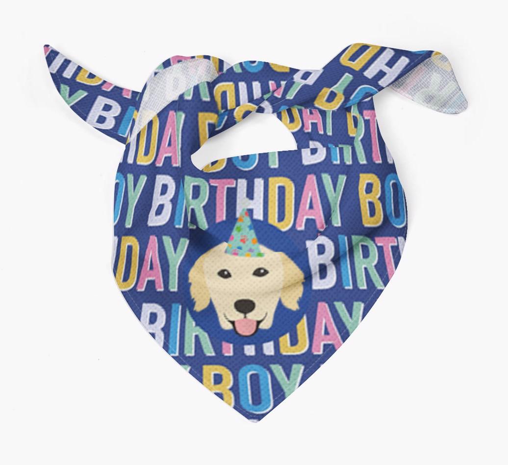 Featuring a colorful text pattern that reads 'birthay boy' and personalized with Dog's cute icon (complete with a fun party hat), your Dog will look simply pawgeous on their special day when they're wearing this bandana.