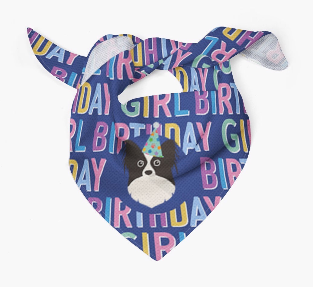 Featuring a text pattern that reads 'birthay girl' and personalized with Papillon's cute icon (complete with a fun party hat), your Papillon will look simply pawgeous on their special day when they're wearing this bandana.