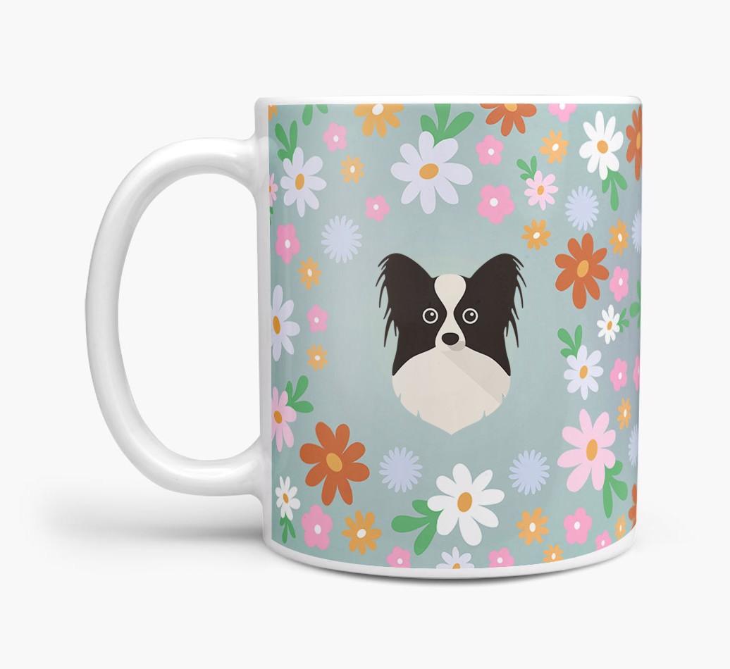 Featuring a colorful bunch of flowers, this mug is printed with the words 'woofly grandma' on one side of the mug and your Papillon's cute icon on the other. Bloomin' lovely!