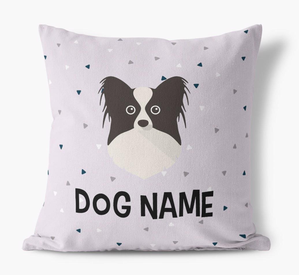 Featuring a stylish triangle pattern, this pillow is available in 5 wagnificent colors and is personalized just for Your Papillon, making is extra special.